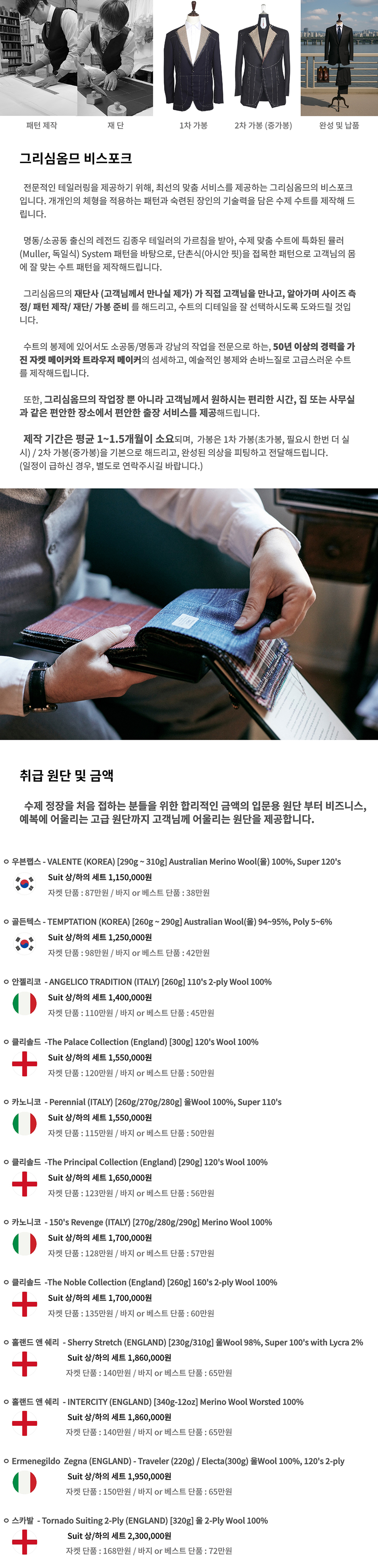 그리심옴므의 재단사가 직접 사이즈측정, 패턴제작, 가봉을 제공하여 고급 비스포그 수트를 제공합니다.