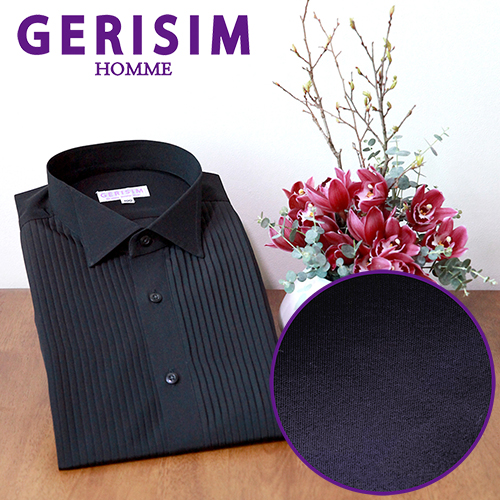 그리심옴므 블랙 턱시도셔츠 실크제작, 세로핀턱 장식, 윙칼라 기본크기 적용.