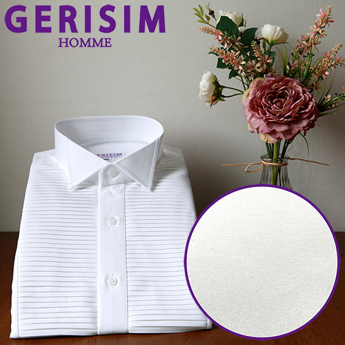 그리심옴므 화이트 턱시도셔츠 실크제작, 가로핀턱 장식, 윙칼라 기본크기 적용.