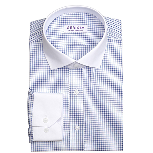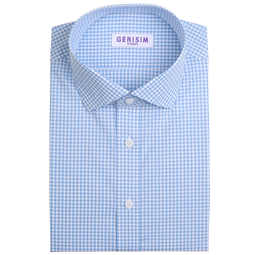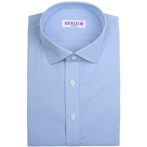 미니 사이즈의 Gingham 하늘색 체크는 멀리서 보면 단색으로 보일 정도로 조밀한 깅엄 체크로 차분하면서 지적인 느낌을 주는 드레스셔츠입니다. (줄무늬 폭 1mm)